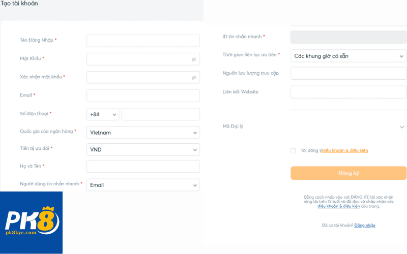 Ở trang Đại lý PK8 tìm kiếm mục Đăng Ký và điền các thông tin đăng ký mà nhà cái yêu cầu, lưu ý thông tin mà bạn đăng ký phải chính chủ:
